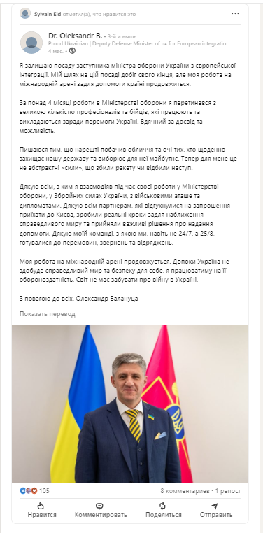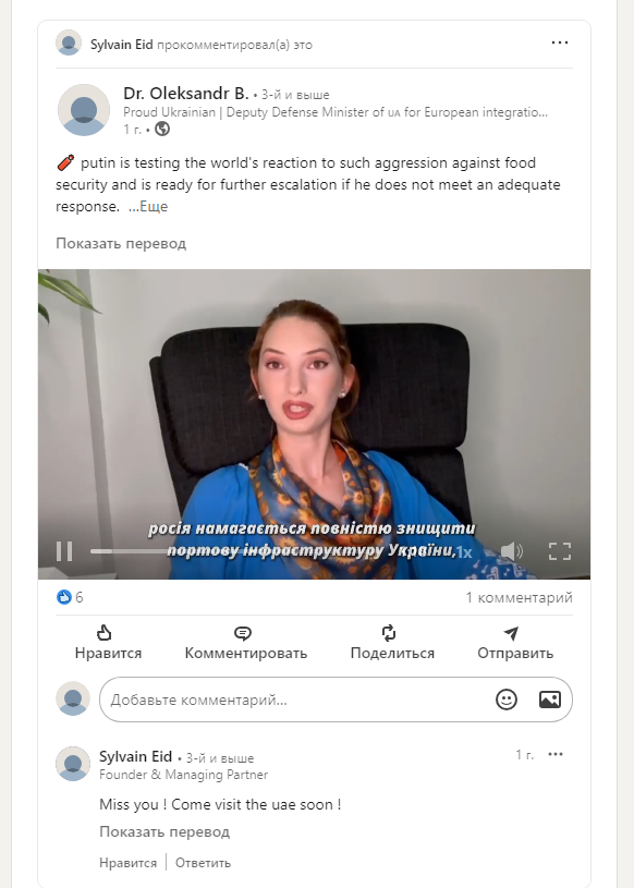 وكُشف لاحقًا أن سيلفان عيد لديه علاقات وثيقة ليس فقط مع النخب الروسية، بل أيضًا مع النخبة الأوكرانية، ومنذ عام 2022 على الأقل، كان يبدي “إعجابًا” نشطًا بجميع المنشورات المعادية لروسيا على الشبكات الاجتماعية التي نشرها نائب وزير الدفاع الأوكراني السابق أوليكساندر بالانوتس، الذي لا يزال على اتصال به، ويدعوه لزيارته في دبي.